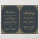 An elegant folded wedding program with a vintage air, having having on both sides two identical elegant gold baroque decorative frames around the texts. The titles and the names of the bride and groom are written in an elegant calligraphic script, the rest in caps. The background is dark blue, the text is golden, similar to the gold frames.