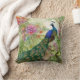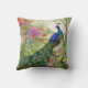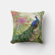 Decorator throw pillow with the vintage painting of an elegant blue and green peacock in a lush forest of pink floral and greenery.