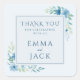 Add a romantic finishing touch to your celebration with this refined wedding sticker, featuring soft blue watercolor flowers and leafy green foliage artfully arranged in a timeless botanical frame. Your names are elegantly displayed in a classic serif font for a sophisticated, personalised accent. The pastel soft colour palette and rustic elegant style make this sticker perfect for garden party table decor, autumn wedding mementos, or as a vintage inspired thank you for your guests. Ideal for favours or keepsakes, its delicate design and blue floral detailing create a heartfelt expression of gratitude and thanks capturing the essence of romantic watercolor flowers and the joy of your special day, complete with your wedding date for a lasting remembrance.