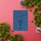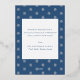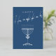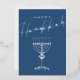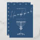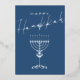 A simple but elegant dark blue Hanukkah flat card with silver foil "Happy Hanukkah" in complementary typography, which feature both a classic, bold block style font and a fanciful handwritten display font sweeiping across the card. An elegant silver menorah is displayed below. The reverse side has a message to use or edit in a classic blue font and a place for family names. The background pattern is the Star of David in an abstract design. Click the personalise button to use the template fields to edit the reverse side of the card.