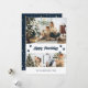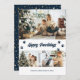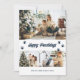 Custom blue photo happy pawlidays cards featuring three photos and paw prints on the front and a blue background with gold stars at the back. Easily personalise these elegant blue photo Christmas cards with your images, a family name and the year. More colour options available. Easily personalise to any colour.