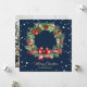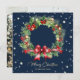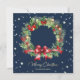 Elegant blue photo Merry Christmas card featuring a watercolor wreath of berries, holly, pine cones and conifer tree branches. A photo at the back. Easily personalise this blue photo holiday card with your photo and family name.
