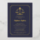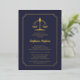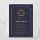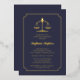 A libra legal scales of justice and scalloped frame gold foil and blue graduation party invitation design that can be personalised for law or other legal field school graduations. Composite design by Holiday Hearts Designs (rights reserved).