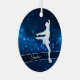 This elegant ornament features a silver silhouette female ice skater against a pretty blue background with tiny star lights. Her name is in silver on a semi transparent banner that is framed in white faux glitter. The back of the ornament has the same blue background with three custom text fields at the centre. Perfect for that daughter, granddaughter, or niece who is a skater.
