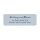 This return address label features a simple, elegant layout with centred text on a solid light blue background. The design uses a soft pastel colour palette and combines an elegant cursive script for the names with clean serif typography for the address, creating a sophisticated and organised appearance. Its minimalistic style emphasizes clarity and tranquillity, making it perfect for those who appreciate understated elegance in their stationery.
