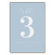 This elegant wedding table card features a minimalist design with a soft pastel blue background. The layout is clean and balanced, showcasing a large numeral "3" in bold white font at the centre, complemented by cursive script for the word "table." Customisable names and date are presented in a modern sans-serif typeface, adding a touch of sophistication. The overall mood is serene and understated, perfect for creating an inviting atmosphere at your special event.