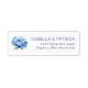 This return address label features a minimalist design with a large, beautifully illustrated blue peony on the left side, rendered in watercolor-like textures for a soft and delicate appearance. The colour palette includes various shades of blue complemented by muted greens, creating a serene and calming mood. Elegant serif typography is used for the customisable text on the right, arranged vertically to maintain balance and readability. The overall style is sophisticated and understated, perfect for adding a touch of elegance to your correspondence.