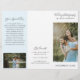 Modern photography trifold brochure featuring a photo on the front with your business name above and the brochure title below, over a white background. The outside back panel has your contact information with the header in an elegant handwritten font. The inside fold panel has a template for information along with a photo on the bottom over a pastel blue background. The inside has one picture on the left and right panels along with a template for information on the left, your packages in the middle and an A la carte price list on the right panel. This professional trifold brochure is perfect for a wedding photographer.