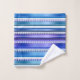 Bathroom towel set with an abstract artistic stripe pattern in teal blue and purple with white.
