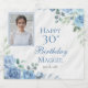 Elegant blue and white with dusky sage green greenery floral frame "Happy Birthday" party celebration design.