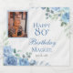Elegant blue and white with dusky sage green greenery floral frame "Happy Birthday" party celebration design.