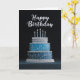 A striking birthday card featuring a shimmering blue and silver tiered cake set against a dramatic black background. With delicate details, glowing candles, and elegant “Happy Birthday” lettering, this design is perfect for a sophisticated and memorable celebration.