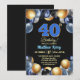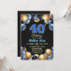 An elegant modern design featuring blue 40 number with gold edges and balloons with silver, blue and gold glitter. Customize the details for a unique and chic Birthday Celebration.