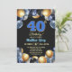 An elegant modern design featuring blue 40 number with gold edges and balloons with silver, blue and gold glitter and a special photo of the birthday person on the back of the invitation. Customize the details for a unique and chic Birthday Celebration.