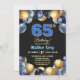 An elegant modern design featuring blue 65 number with gold edges and balloons with silver, blue and gold glitter and a special photo of the birthday person on the back of the invitation. Customize the details for a unique and chic Birthday Celebration.