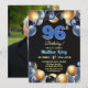 An elegant modern design featuring blue 96 number with gold edges and balloons with silver, blue and gold glitter and a special photo of the birthday person on the back of the invitation. Customize the details for a unique and chic Birthday Celebration.