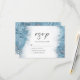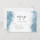 The edges of this elegant modern RSVP card features a light blue watercolor border design in imitation of marble veined with faux silver foil, fading gradually into the white background. The letters "rsvp" appear in charcoal grey handwriting script. The customisable response date and wording are in charcoal grey serif text. The reverse side features a matching blue and silver marble design.