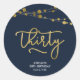This elegant 30th birthday round sticker feature strings of lights and the word "Thirty" in faux gold against a dark blue background. Check out other matching items here https://www.zazzle.com/collections/strings_of_lights_faux_gold_celebration_collection-119311942951401241?rf=238364477188679314