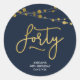 This elegant 40th birthday round sticker feature strings of lights and the word "Forty" in faux gold foil against a dark blue background. Check out other matching items here https://www.zazzle.com/collections/strings_of_lights_faux_gold_celebration_collection-119311942951401241?rf=238364477188679314