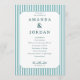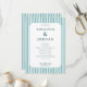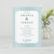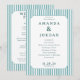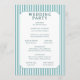 This wedding program features a modern, minimalist design with a vertical layout framed by alternating light blue and white stripes. The colour palette includes soft teal and muted navy blue, creating an elegant and sophisticated look. The typography is clean and classic, using serif fonts to highlight the ceremony details in a structured format. Perfect for couples seeking a timeless and formal aesthetic, this program combines clarity with a touch of refinement, making it ideal for any wedding celebration.