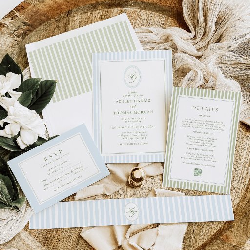 Elegant Blue Stripes Sage Wedding Details Card