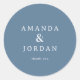 This elegant wedding sticker features a minimalist design with a solid medium-blue background, creating a sophisticated and modern look. The layout centers on clean typography, using bold serif fonts for the names and a contrasting sans-serif font for the phrase "thank you," arranged in a balanced vertical hierarchy. The absence of additional motifs or textures emphasizes simplicity and clarity, making it perfect for expressing gratitude at your special event. Its understated elegance makes it suitable for various personalized touches, ensuring a memorable celebration.
