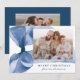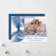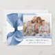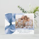 Celebrate the season in style with this elegant Christmas card featuring a stunning blue watercolor bow against a white background. Personalise the design by adding your horizontal family photo in a unique offset layout. Your holiday greeting is displayed in classic blue serif lettering, accompanied by your family name in an elegant handwritten script. With space for an additional photo on the back, this card allows you to share even more cherished memories. Perfect for spreading festive joy while showcasing your personal touch.