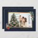 Elegant custom watercolor photo Christmas cards featuring a dark blue photo frame decorated with watercolor illustrations of poinsettia, lantern, and ornaments on a pine tree branch with pine cones. Easily personalise these elegant watercolor Christmas photo cards with your image and text.