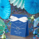 Simple, elegant, minimalist, royal blue wedding favour box, with gold rope heart, names of couple and date.