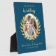 Elegant blue and gold colored wreath custom photo wedding welcome plaque.