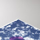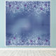 An elegant piece with blue background showing acrylic paint effect, decorated by tiny white dispersed particles and purple flowers.