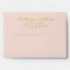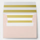 Custom striped 5 x 7 envelopes feature a blush pink background colour with stylish gold coloured return address that can be personalised on the back flap. The inside of the envelope features a pattern of gold and white horizontal stripes.