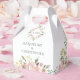 An elegant floral bouquet of pink peonies and ivory roses frame the borders of this lovely spring wedding favour box. The sprigs of sage leaves decorate in the midst of the peach array of flowers that surround the beautiful modern typography on a pretty cream colour. A chic, personalised addition to a garden wedding reception in the summer. This completes the romantic collection.