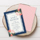 Elegant Floral Baby Shower invitation featuring blush roses, dark coral and yellow flowers, and green leaves with an off white centre and blue borders against a blue background on the front. Invitation has a sweet blush coral gingham back side. It's a perfect invitation for a girl or gender neutral baby shower. Check out more baby shower items here https://www.zazzle.com/rosewoodandcitrus/gifts?cg=196748758771183969?rf=238364477188679314