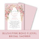 This bridal shower invitation features a soft, romantic blush color palette with an elegant boho floral wreath framing the design. Lush pink peonies, delicate ivory blooms, airy pampas grass, and soft greenery form a graceful arch around the centered text, creating a light and feminine aesthetic. The typography blends flowing script with classic serif fonts, adding a refined and timeless touch. Set against a warm blush background with a subtle border, the overall design feels airy, modern, and beautifully suited for a garden-inspired or romantic bridal shower celebration.