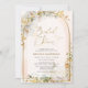 The elegant white and gold floral bridal shower invitation is a stunning work of art that captures the essence of elegance and sophistication. The blush pink background, accented with shimmering gold floral motifs and a luxurious golden frame, creates a sense of opulence and grandeur. The intricate calligraphy, crafted with meticulous attention to detail, adds a touch of refinement and grace, inviting the guests to a celebration of love and joy. This invitation is a true masterpiece, combining exquisite design elements with timeless aesthetics, and setting the tone for a memorable bridal shower that will be cherished for years to come. Matching items are available.