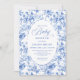 Create a timeless first impression with this baby shower invitation featuring elegant French toile de jouy roses in refined shades of navy blue, royal blue, dusty blue, and deep blue, inspired by classic chinoiserie floral design. This sophisticated style blends heritage elegance with modern charm, making it perfect for a memorable baby shower celebration.