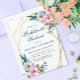 Soft blue, pink, and white boho watercolor flowers within a gold double geometric frame feature botanical and berry flourishes. Customise this elegant boho floral bachelorette weekend itinerary invitation postcard with your own colours and fonts or keep this popular typography as it is for your convenience. MIx and match with other items in this beautiful wedding collection.