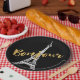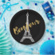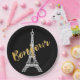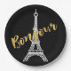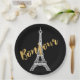 Elegant paper party plate features white Eiffel Tower silhouette with gold modern script on black background