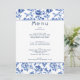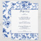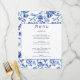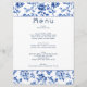 Elevate your wedding reception with this elegant botanical-themed menu, designed to complement a classic and timeless celebration. The sophisticated floral border in deep blue frames the central text, offering a graceful and refined presentation for your guests. With a white vintage-inspired background design brings a touch of old-world charm to your modern celebration. Perfect for adding an extra layer of beauty to your table setting, this menu guides your guests through the delicious courses planned for your big day. Ideal for couples seeking an elegant, traditional aesthetic for their wedding.