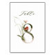This table number card features a green and rose gold number decorated with watercolor illustrations of flowers and leaves in blush pink, red, and green. This table number is perfect for weddings, graduations, baby showers, bridal showers, anniversaries, and other events.