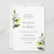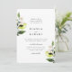 Elegant botanical lemon branches and floral blossom arrangements, wedding invitation. Modern and simple typography design style template. Back of card features coordinating solid light dusted airy blue colour.
