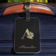Elegant black luggage tag with a gold botanical monogram in the centre.
