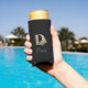 Elegant black can cooler with a gold botanical monogram in the centre.
