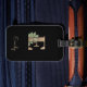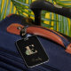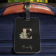Elegant black luggage tag with a gold botanical monogram in the centre.