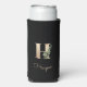 Elegant black can cooler with a gold botanical monogram in the centre.