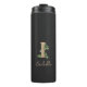 Elegant black thermal tumbler with a gold botanical monogram in the centre.