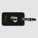 Elegant black luggage tag with a gold botanical monogram in the centre.