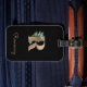 Elegant black luggage tag with a gold botanical monogram in the centre.