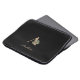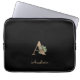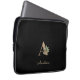 Elegant black laptop sleeve features a gold botanical monogram in the centre.